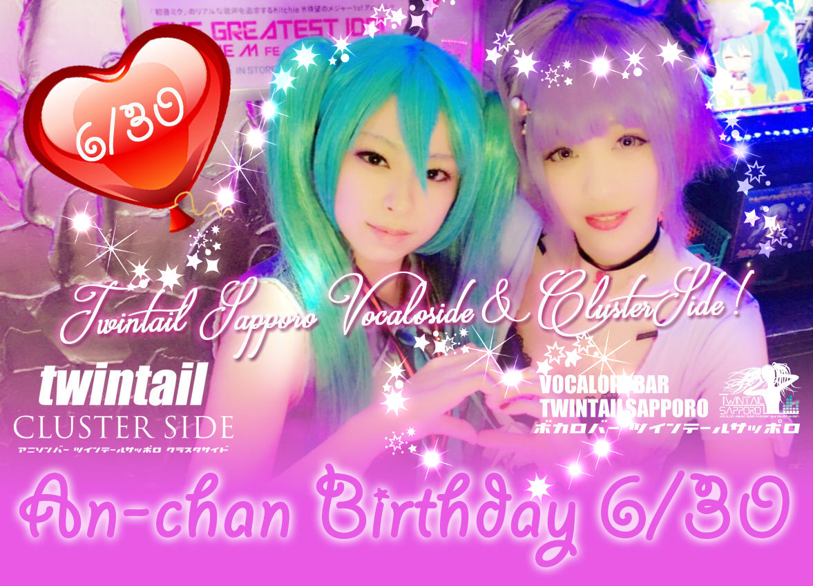 2週連続のバースデーイベント!今週はあんちゃんのバースデーイベントが6/30土曜日に開催!マニアックなボカロからアニソンまで幅広いジャンルを網羅するレンくんをこよなく愛するオールラウンダーあんちゃん!テキーラ3日分が大好物!(笑) あんちゃん楽しいよねえ!というわけであんちゃんのお誕生日を一緒に楽しみましょ!あんちゃんの画像あまりなかったので特別出演にリグさんがいますがバースデーイベント当日にリグさんはおりません.。゚+.(・∀・)゚+.゚